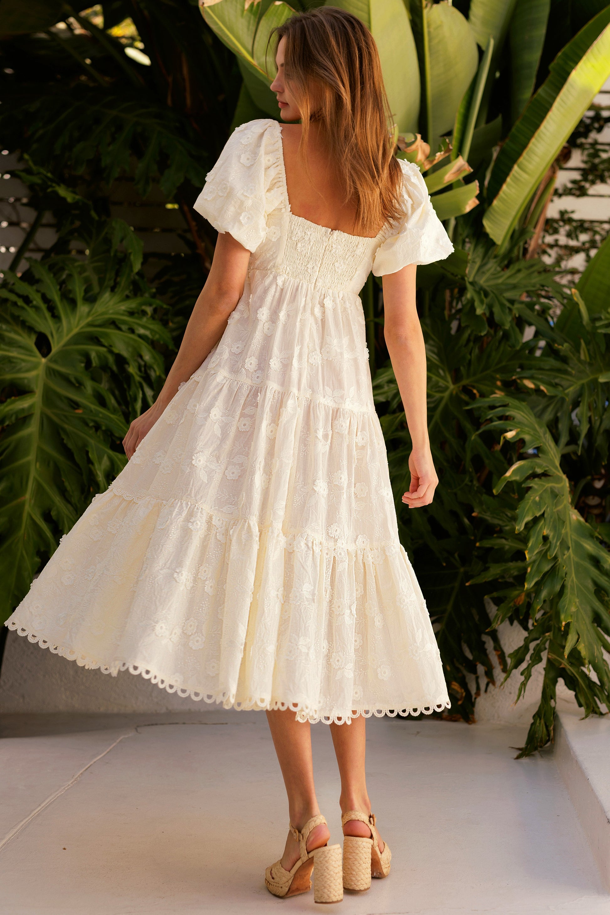 Hermoso y fino vestido midi bordado en color crema. Tiene spandex en la espalda.