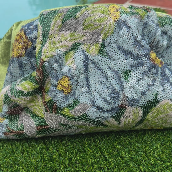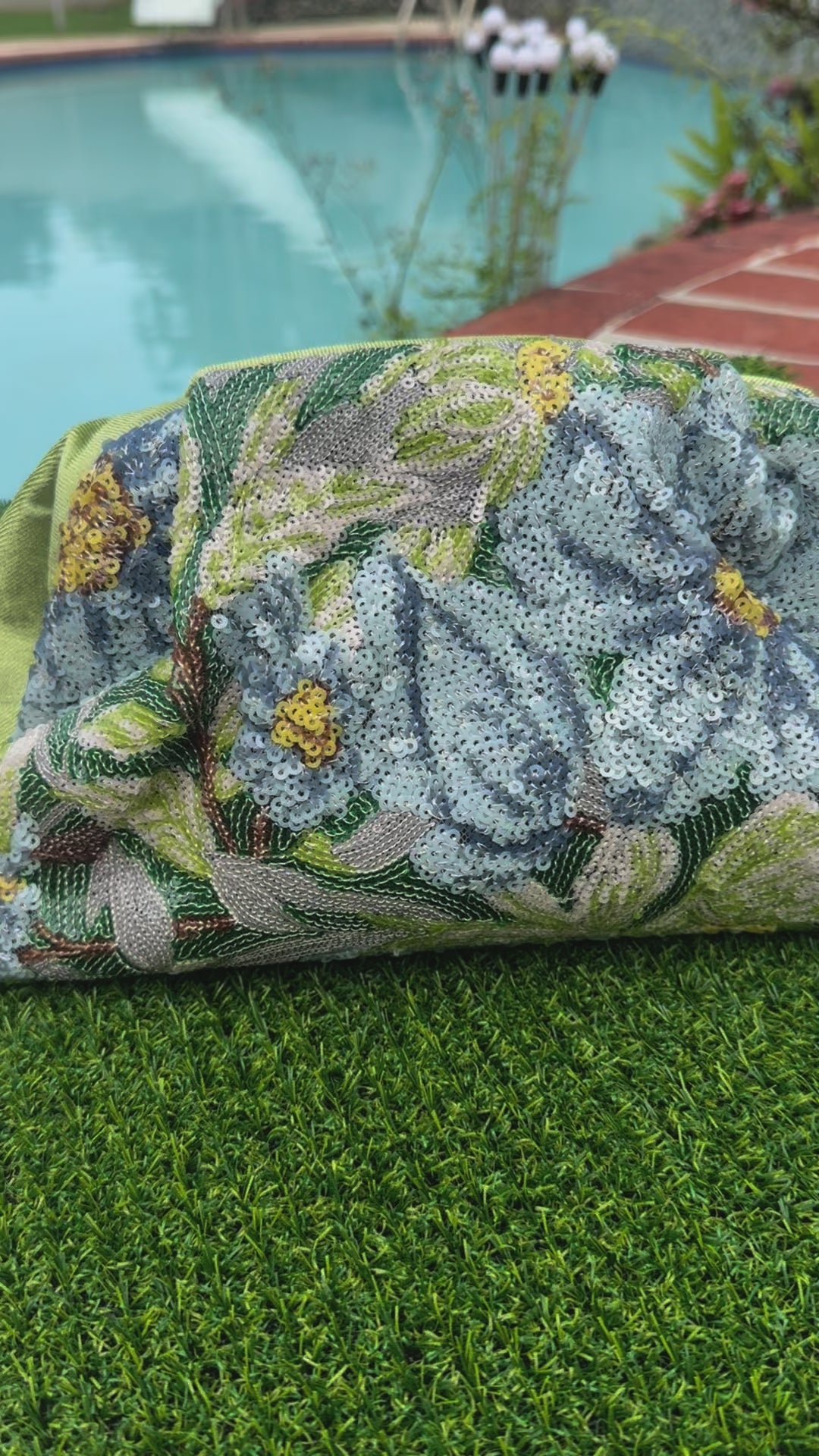 Sequin & Velvet Clutch. Beautiful and Classy green tones with blue and yellow flowers with just a tone of sparkles. The Back part is all green Velvet.